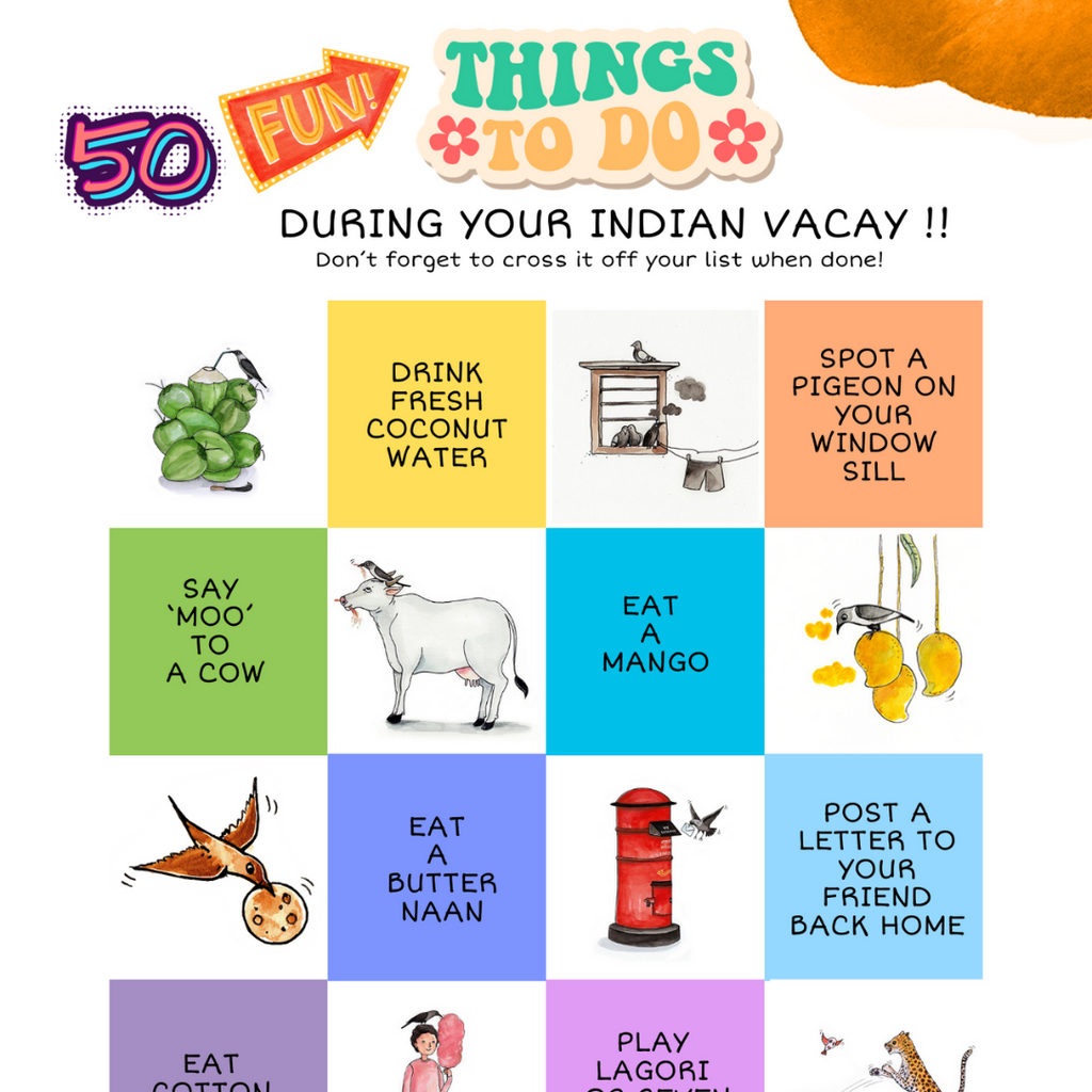 Well, it's 50 fun things that will definitely be present in any Indian city. As your little one spots it and experiences it, they can cross it off the list. What fun, right? You can print it out or use it on your phone - an easy way to help kids connect and explore India.